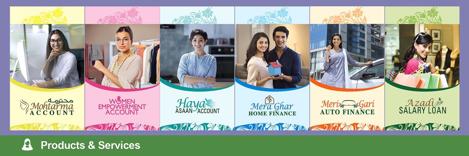 Products and Services Events and Activities Mohtarma Account Saadat Mohtarma Account Mera Ghar Home Finance Meri Gari Auto Finance Azadi Salary Loan Haya Asaan Account Women Empowerment Account